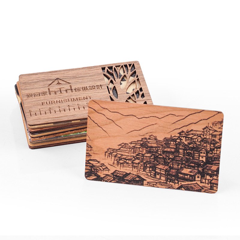 Our 3mm thick wooden business cards come in Finnish birch, Canadian maple, bamboo, American cherry, and black walnut, each selected for its unique color and characteristics. Laser-cut from larger sheets, every card possesses a one-of-a-kind grain. The strata construction ensures strength, eliminating weaknesses and allowing for intricate cut patterns without compromising durability.